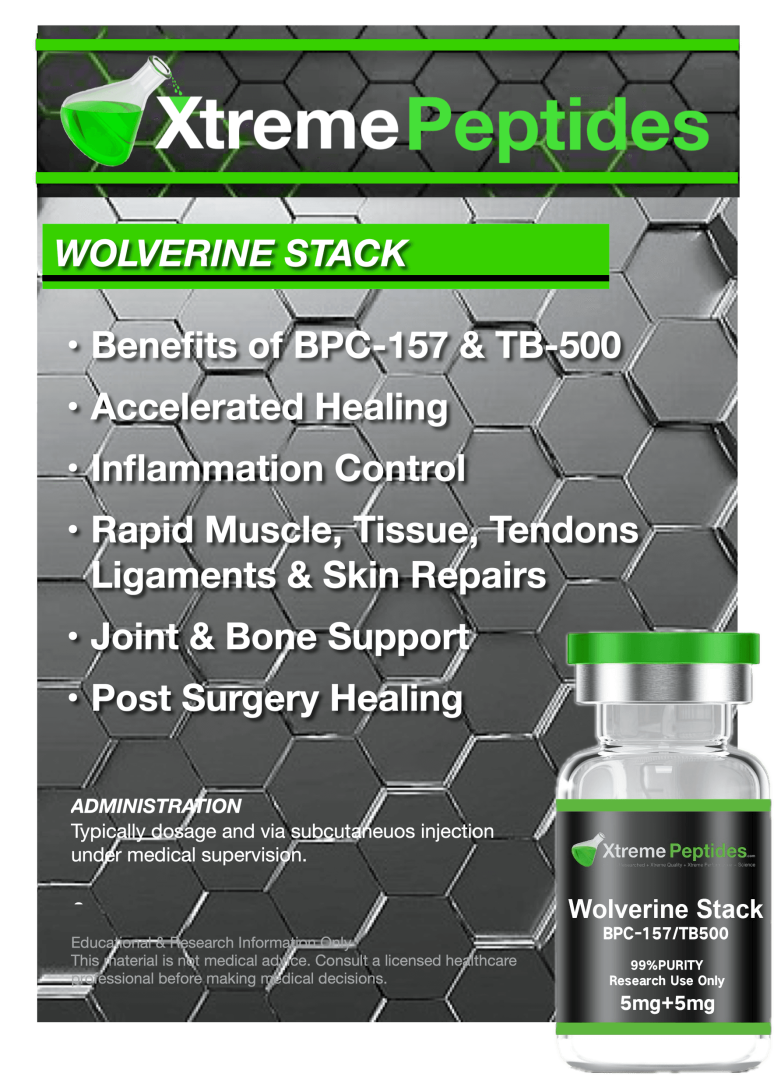 The Wolverine Stack is a premium research blend combining BPC-157 and TB-500, two extensively studied peptides known in scientific literature for their role in cellular signaling, tissue pathways, and recovery-related research models.